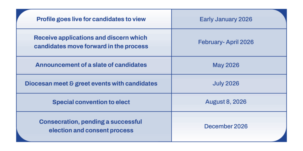 As this process unfolds, your search committee invites you to look for updates on the website as well as in the diocesan enews. If you have questions, please contact us at bishopsearch@dionwpa.org.